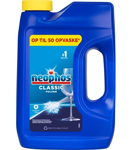 Neophos Maskinopvaskepulver Neophos er det førende opvaskemærke på globalt plan og har ligget i front indenfor maskinopvask i mere end 60 år. Samtidig er Neophos verdens største brand inden for maskinopvaskeprodukter og er det mest anbefalede mærke af de førende opvaskemaskineproducenter. Neophos forbedrer kontant deres produkter og følger tidens trends, så du altid er sikret en ren og skinnende opvask mange år frem i tiden og deres mission er at hjælpe deres kunder med at opnå den renest mulige opvask hurtigt og nemt. Neophos Classic maskinopvaskepulver klassisk opvaskepulver, som giver en klassisk og skinnende ren opvask første gang – hver gang! Neophos Classic er et godt og effektivt maskinopvaskepulver til hverdagsbrug, til den daglige opvask og den praktiske iblødsætningsfunktion, gør at det nemt blødgør hårde og indtørrede madrester og derfor let klarer alt lige fra lasagnerester og morgenmadsskåle til beskidte gryder og pander. Neophos maskinopvaskemiddel er samtidig med til at nedsætte det daglige vandforbrug, da de effektive formler sikrer at du ikke længere behøver at skylle dit beskidte service af, inden du kommer det i opvaskemaskinen. På den måde sparer du både tid og penge og bidrager samtidig til et mere ansvarligt forbrug af naturens ressourcer. Indhold: 1 kg Dosering 20 - 30 ml / vask Sikrer en klassisk og skinnende ren opvask Praktisk iblødsætningsfunktion Spar på vandet – ikke nødvendigt at skylle af Har du måske bemærket at denne nye dunk er mindre i forhold til hvad du var vant til? Neophos har øget koncentrationen af pulveret til at være mere kraftfuldt. Det betyder, at hvor man tidligere doserede 40 - 45ml* per vask så kan man med denne nye 1kg dunk nøjes med 20 - 30ml* *Doseringen bør varierer afhængigt af hvor beskidt servicen er. Lidt beskidt = mindre dosering / meget beskidt = større dosering. Det samme gør sig gældende hvis maskinen ikke fyldes helt. ...