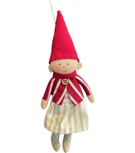 Sød lille nisse til ophæng Skab ægte dansk julestemning med denne lille søde nissepige. Nissen er klædt i klassiske julerøde farver med en fin stribet trøje, en sød kejleformet nissehue og en hyggelig stribet kjole. Perfekt som juleophæng på træet, i vinduet eller noget helt tredje, hvor den kan sprede glæde og hyggelig julestemning. Farve: Rød/Beige Dimension (HxBxD): 22 x 7 x 3 cm Materiale: Polyester/Bomuld ...