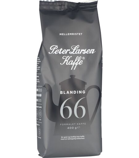 Grå Peter Larsen Kaffe - Blanding 66 Den Grå Kaffeblanding 66 fra Peter Larsen Kaffe er det helt rigtige valg, hvis du vil have en god og kraftig kop kaffe med en harmonisk eftersmag. Kaffen består af af klassiske kaffesorter fra verdens store kaffeproducerende lande: Syd- og Mellemamerika samt Østafrika. Det er en dejlig intensiv kaffe med en behagelig bitterhed - perfekt til dig, der kan lide en kop kaffe med karakter. Indhold: 400g Type: Formalet kaffe Bønnetype: Arabica og Robusta Ristningsgrad: Mellemristet Ristning (skala 1-5) 3 Fyldighed (skala 1-5): 5 Syrlighed (skala 1-5): 2 Emballagen kan affaldssorteres som plast Tip til tilberedning: Brug 5 - 6g kaffe pr. kop (1,5dl). Brug vand fra den kolde hane. Bryg kaffen ved 92 - 95 grader. Undgå omhældning - for kaffen har det bedst i sin originale emballage. Kærlighed til kaffe siden 1902 Peter Larsen Kaffe startede i 1902 og har idag udviklet sig til en moderne kaffevirksomhed. Som et symbol på kærligheden til kaffe, har firmaet Danmarks største kaffekande stående som vartegn ved Holstebrovej i Viborg. Den store blå kaffekande kan rumme 75.000 kopper kaffe, er 4,96 meter høj og vejer 1,2 tons. ...