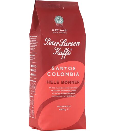 Peter Larsen Santos Colombia hele kaffebønner Santos Colombia er en 100% Arabica kaffe blandet af bønner fra Sydamerika, Mellemamerika og Østafrika. Santos og Colombia helbønnerne giver tilsammen en fyldig og frisk kop kaffe. Smagen er mild og frisk, med en rund eftersmag. Det gør Santos Colombia fra Peter Larsen Kaffe til et oplagt valg, når du trænger til en harmonisk kaffestund. De hele ristede kaffebønner er Rainforest Alliance certificerede. Det betyder, at du støtter dyrkningsområdet miljømæssigt, socialt og økonomisk, når du køber Peter Larsen Santos Colombia helbønner. Indhold: 450g Type: Helbønner Bønnetype: Arabica Ristningsgrad: Mellemristet Ristning (skala 1 - 5): 3 Fyldighed (skala 1-5): 4 Syrlighed (skala 1-5): 3 Rainforest Alliance certificeret Tips til tilberedning: Brug 6 - 7 g kaffe pr. kop (1,5dl). Brug vand fra den kolde hane. Bryg kaffen ved 92 - 95 grader. Undgå om muligt omhældning - for kaffen har det bedst i den originale emballage med praktisk genluk. Få en ekstra god smag i munden med Peter Larsen Kaffe Peter Larsen er danskernes kaffespecialist. De fleste af firmaets kaffebønner er certificerede med enten økologi, Fairtrade eller Rainforest Alliance. Det passer i den familiedrevne virksomheds DNA - og det underbygger Peter Larsens Kaffes 4 værdier: Kvalitet, Passion, Innovation og Ansvarlighed. Firmaet startede i 1902 og har idag udviklet sig til en moderne kaffevirksomhed. Som et symbol på kærligheden til kaffe, har firmaet Danmarks største kaffekande stående som vartegn ved Holstebrovej i Viborg. Den store blå kaffekande kan rumme 75.000 kopper kaffe, er 4,96 meter høj og vejer 1,2 tons. ...