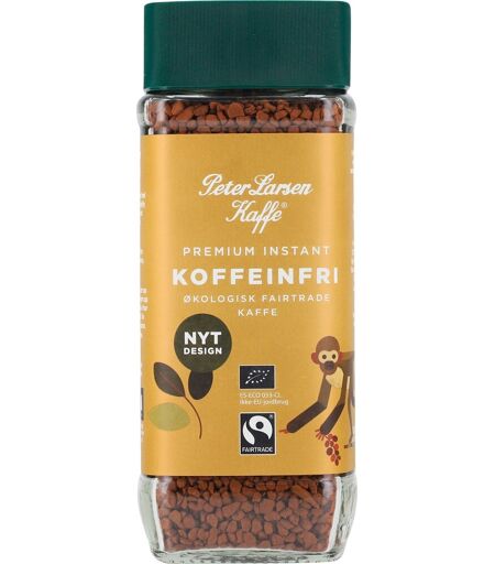 Peter Larsen Kaffe Koffeinfri Instant - til en hurtig og udsøgt kop Dejlig koffeinfri instant kaffe fremstillet af økologiske Arabica kaffebønner fra nøje udvalgte kaffefarme i Syd- og Mellemamerika. Smagsoplevelsen er blød og fyldig med en let nøddeagtig aroma og en behagelig syrlighed. Et oplagt valg når du vil have fordelen af at kunne brygge en hurtig kop kaffe uden koffein - men ikke vil gå på kompromis med den gode smag. Kaffebønnerne er renset for koffein ved hjælp af almindelig kuldioxid (CO2) under højtryk. Det er en selektiv og ren metode uden kemikalier, som bevarer smagsstoffer og aromastoffer. Desuden er bønnerne certificeret fairtrade. Det betyder, at alle mellemhandlere fra kaffebonden til de endelige distributører opfylder de vedtagne standarder. Samtidig får kaffebønderne en garanteret minimumspris på deres varer, og en fairtrade bonus, som de kan anvende til at modernisere deres landbrug. Indhold: 100g Type: Instant kaffe - koffeinfri Bønnetype: Arabica Glassets indhold giver 50 kopper god kaffe Tips til tilberedning: 2 gr. pr kop (1,5 dl.). Kom 1-2 tsk. kaffe i en kop, tilsæt kogende vand og rør rundt. Hurtigt, nemt og lækkert! Få en ekstra god smag i munden med Peter Larsen Kaffe Peter Larsen er danskernes kaffespecialist. De fleste af firmaets kaffebønner er certificerede med enten økologi, Fairtrade eller Rainforest Alliance. Det passer i den familiedrevne virksomheds DNA - og det underbygger Peter Larsens Kaffes 4 værdier: Kvalitet, Passion, Innovation og Ansvarlighed. Firmaet startede i 1902 og har idag udviklet sig til en moderne kaffevirksomhed. Som et symbol på kærligheden til kaffe, har firmaet Danmarks største kaffekande stående som vartegn ved Holstebrovej i Viborg. Den store blå kaffekande kan rumme 75.000 kopper kaffe, er 4,96 meter høj og vejer 1,2 tons. ...