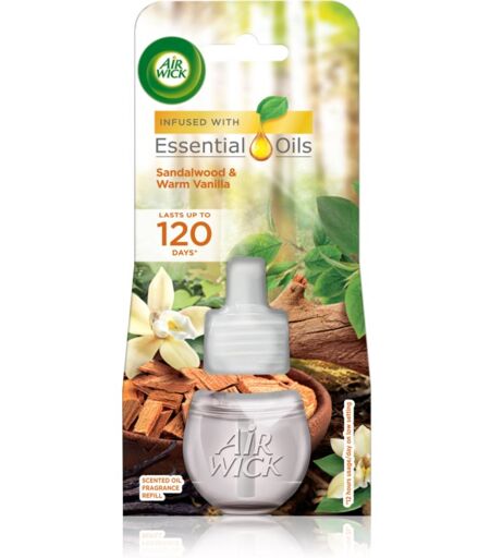 Air Wick Electric Sandalwood & Vanilla, 19 ml, Luftfriskere Dufte til hjemmet, Glæd dine duftceller. Indholdet i den elektriske aromadiffuser Air Wick Electric Sandalwood & Vanilla fylder ethvert interiør med en behagelig duft og skaber effektivt en behagelig stemning. Egenskaber: træduft sød aroma orientalsk aroma duft af varme Ingredienser: indeholder essentielle olier Brugsvejledning: Udskift indholdet som anvist i den vedlagte brugsanvisning. Opbevares uden for børns og husdyrs rækkevidde. Hvis produktets indhold kommer i kontakt med huden, skal du øjeblikkeligt vaske den med masser af vand og sæbe. Skyl i nogle minutter med vand, hvis det kommer i øjnene. ...