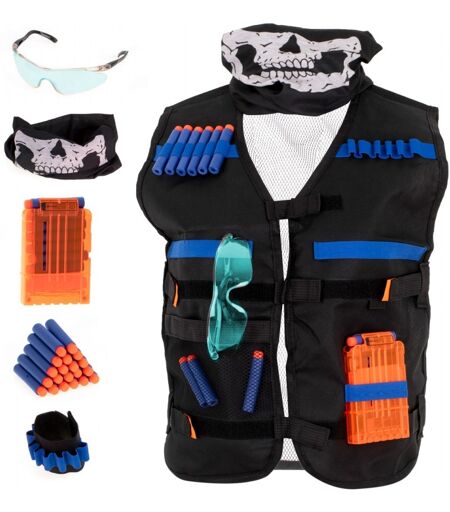 Vest lavet af slidstærkt materiale. Den har velcrobånd og ekstra opbevaringsplads til det tilbehør, du har brug for. Indeholder: vest, bandana, beskyttelsesbriller, 20 Nerf dart, magasin og armbånd. Mål: 52x46 cm. ...