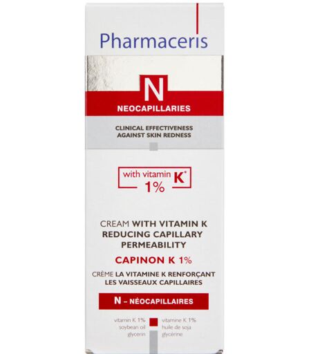 Pharmaceris N Capinon K 1% ansigtscreme anbefales til den daglige pleje af følsom hud med forstørrede kapillærer (blodkar) med tendens til periodisk overaktivitet, som viser sig under indflydelse af eksterne faktorer såsom alkohol, krydret mad, stærke følelser eller pludselige ændringer i temperatur. Anbefales til brug før og efter medicinske og kosmetiske behandlinger, til at styrke blodkar, og til at reducere rødme samt fremskynde hudens regenerering. Anbefales også til hud som er tilbøjelig til blå mærker og skygger under øjnene. Dosis og anvendelse Anvend cremen dagligt på det område, hvor problemet forekommer. Påfør et tyndt lag af cremen på ren og tør hud og massér derefter blidt, indtil cremen er absorberet. Ved stærke ændringer, anvend da cremen 2 gange dagligt, indtil disse er forbedret, og benyt derefter forebyggende 1 gang dagligt. I tilfælde, hvor huden viser en tendens til hyperaktivitet i blodkarrene, anvendes cremen til daglig pleje. Under brug af produktet kan der forekomme midlertidigt ubehag og irritation i huden, som er en naturlig reaktion på forøget aktivitet af de aktive ...