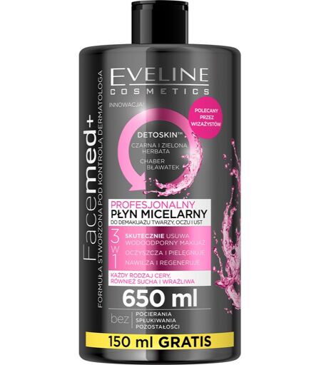 Eveline Cosmetics FaceMed+, 650 ml, Rens til kvinder , Micellarvandet Eveline Cosmetics FaceMed+ er beriget med små aktive partikler, der binder alle urenheder og fedt til sig ved kontakt med huden. Takket være disse partikler, såkaldte miceller, sikrer vandet en grundig fjernelse af makeup på bare et par minutter, og uden at det er nødvendigt at trykke eller gnide på huden. Miceller er så effektive, at de også uden problemer kan klare holdbar vandfast makeup. Egenskaber: fjerner også vandfast makeup gennemfugter i dybden genopbygger har en forfriskende og beroligende virkning Brugsvejledning: Kom rigeligt af præparatet på en vatrondel. Fjern makeuppen og rens huden med lette bevægelser. Skyl ikke. ...