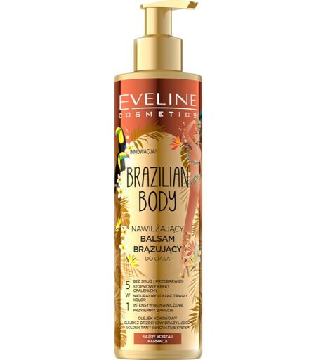 Eveline Cosmetics Brazilian Body, 200 ml, Selvbrunende produkter til kvinder , Selvbruningspræparat til kroppen Eveline Cosmetics Brazilian Body er en garanti for en smuk, solbrun hud hele året. Egenskaber: forener hudens tone smidiggør og blødgør huden giver huden et sundt, solbrændt look forener solbrune nuancer og farver skånsomt Gør gradvist hudfarven mørkere Brugsvejledning: Anvend på den rene hud og masser blidt, indtil det er trængt helt ind. Vask hænderne grundigt efter påføring. ...