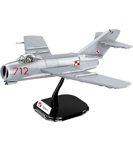 Lim-1 jagerflyet er en russisk Mikoyan MiG-15 bygget på licens af den polske luftfartsindustri. Lim-1-flyene var udstyret med Lis-1-motoren, som også blev fremstillet på licens i Polen. Det første Lim-1 fly blev fløjet i 1952. Omkring 227 enheder af dette fly blev produceret i over to år. Modellen af COBI er skabt af 504 klemblokelementer i en skala fra 1:32. Alle markeringer og inskriptioner på modellen er aftryk, der ikke gnider af under brug. Modellen har bevægelige elementer såsom hjul og en kabine, der kan åbnes, hvor vi kan placere den medfølgende figur af en polsk pilot. Sættet indeholder et displaystativ med et skilt med navnet på sættet og nationalitetsmærket. ...