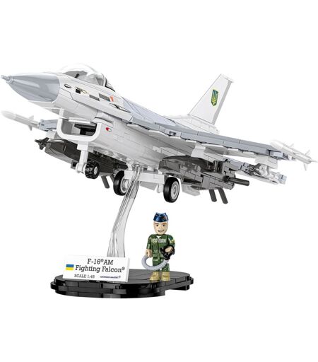 F-16 Fighting Falcon er et multirollefly fremstillet af General Dynamics. Siden 1993 er den blevet produceret af forsvarsfirmaet Lockheed Martin. Det bruges af luftvåben fra snesevis af lande rundt om i verden. Med dette sæt fra COBI skabes en model af dette fly i Ukraines farver - i skala 1:48 og lavet af 500 dele. Modellen er udstyret med to kraftige Storm Shadow krydsermissiler (SCALP-EG), AIM-9 SIDEWINDER og AIM-120 AMRAM missiler. Bevæbningen er aftagelig og kan frit konfigureres eller placeres på andre fly fra COBI''s Armed Forces samling. Sættet indeholder også en figur af en ukrainsk pilot, udstyret med en hjelm og en iltmaske med en slange. Sættet suppleres af en udstillingsbase med et skjold med navnet på sættet, det nationale flag og Lockheed Martin-logoet. Alle inskriptioner og grafik er lavet som permanente tryk, sættet indeholder ikke klistermærker. ...