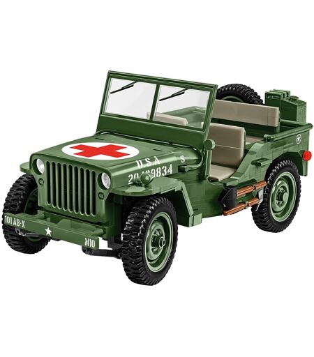 Jeep Willys MB er et legendarisk terrængående køretøj, der spillede en nøglerolle i Anden Verdenskrig. Den blev fremstillet af det amerikanske firma Willys-Overland Motors og var en del af et militært program for at levere køretøjer til den amerikanske hær og dens allierede. Willys MB var kendetegnet ved enkelt design, soliditet og pålidelighed under vanskelige feltforhold. Dens kompakte størrelse, robusthed og evne til at navigere i vanskeligt terræn har gjort den til en legende i bilhistorien. Denne klemklodsmodel fra COBI består af 1131 komponenter og viser imponerende detaljer og høj realisme i en skala fra 1:12. Medical-modellen er udstyret med den typiske Røde Kors-bemaling og har et fungerende rat. Hjulene med gummidæk drejer. Byggeklodserne er forsynet med tryk af høj kvalitet. ...