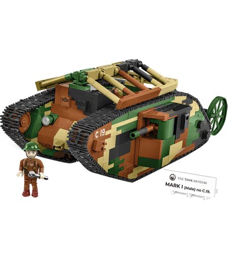 Den britiske Mark I (Male) kampvogn blev produceret i 1916 under Første Verdenskrig og kan nu genskabes som en 28 cm lang model af 878 COBI byggeklodser. Takket være brugen af modellen i skala 1:35 passer modellen til COBI-figurer og andre køretøjer, der er udgivet i denne størrelse. Tanken er udstyret med et fungerende kædetræk, roterende kanoner og åbningsklapper. Markeringer og emblemer er lavet af farverige blokke og holdbare prints, der ikke slides selv ved intensiv brug. Sættet indeholder en figur af et britisk tankskib fra Første Verdenskrig samt et skjold med køretøjets navn og logoet for kampvognsmuseet, som huser den originale kampvogn. ...