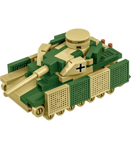 Panzerkampfwagen IV er en tysk medium kampvogn produceret under 2. verdenskrig. Denne minimodel lavet af COBI byggeklodser er designet i en skala på 1:72 og består af 128 elementer af høj kvalitet. Når den er bygget, er tanken 9,5 cm lang. På trods af sin kompakte størrelse bevarer modellen alle de vigtige funktioner fra sin historiske forgænger! Tyske mærker er trykt på bilens sider. Detaljer som serviceklapper og motorventilation er også trykt. Takket være de monterede hjul kan tanken flyttes. Tankens tårn er også bevægeligt og kan drejes. Særligt bemærkelsesværdigt er sidedækslerne på skroget og tårnet, som er så karakteristiske for Panzer IV Ausf. ...