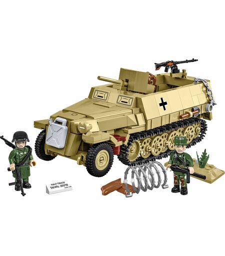 2-i-1-versionen af Sd. Kfz. 251 halvbælteinfanterikampkøretøjet er blevet trofast gengivet med COBI-spændemoduler i målestoksforholdet 1:35! Under konstruktionen kan du udstyre ham med en Pak-36 kanon eller to MG-34 maskingeværer. Der er ingen klistermærker her, kun langtidsholdbare udskrifter af høj kvalitet. Køretøjet har bevægelige hjul med rigtige dæk. Sporgrebet, der består af realistiske bloklinks, fungerer og opfører sig som en rigtig tankbane, når køretøjet flyttes. Hængslede bagdøre, to maskingeværer, en kanon og andet tilbehør gør det endnu mere attraktivt at lege med transporten. Sættet suppleres af to figurer. Den første viser en infanterist i en lang frakke, den anden figur er en pansergrenader. Soldaterne er udstyret med hovedbeklædning, en byggeklods, der efterligner en gasmaske og en kantine, våbenbælter, en MP 40 maskinpistol, en bazooka panserværnsgranatkaster og en Mauser-riffel. Sættet er udviklet med sans for detaljer og er også en perfekt forlængelse af den populære Historical Collection! ...