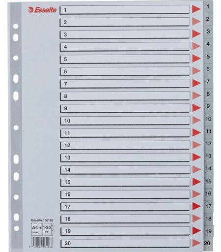Esselte Register er ideelle, når der skal skabes struktur og orden Maxi størrelsen er ekstra brede registre, som er perfekt til brug, når du benytter plastlommer i brev- og ringordnere. Registrene er nemme at bruge, idet inddelingen er markeret med rødt “piledesign” og der er holdbare forstærkede huller i siden. Farve: Grå A4 format maxi Materiale: Kraftig PP-folie Inddeling: 1-20 Producentens varenummer: 100126 ...