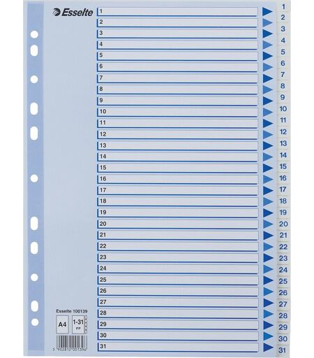 Esselte Register A4, PP, Hvid, 1-31 Kraftig PP-folieNem inddeling med blåt "pile design"Holdbare, forstærkede huller Producentens varenummer: 100139 ...