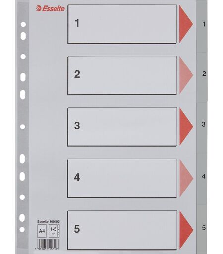 Esselte register i høj og anerkendt kvalitet Registrene i den anerkendte kvalitet fra Esselte har forblad med store skriveområder, så du nemt kan notere indholdet. Registrene har plastforstærket holdbar hullet stribe på forbladet og nem inddeling med rødt “piledesign”. Farve: Grå Materiale: Kraftig PP-folie Inddeling: 5 faner printet med 1-5 11 universalhuller A4 format Producentens varenummer: 100103 ...