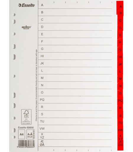 Esselte Mylar Register, A4, A-Å Enkelt farvetServo registre i karton. Producentens varenummer: 69866 ...