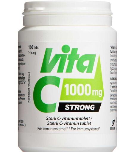 Vita C Strong er et kosttilskud med 1000 mg C-vitamin. Vita C Strong kan med fordel tages i de perioder, hvor der er behov for ekstra C-vitamin. Vita C Strong bidrager til immunsystemets normale funktion. Til voksne. Vegansk. Laktosefri og glutenfri. Dispenseringsform Tabletter Dosis og Anvendelse Anbefalet daglig dosis til voksne: 1 tablet. Tabletterne sluges med vand og kan med fordel tages sammen med et måltid, da C-vitamin også øger optagelsen af jern. Den anbefalede daglige dosis, 1 tablet, ...