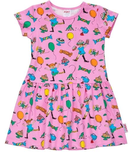 En blød og behagelig Pippi-kjole til børn. Med korte ærmer, rund halsudskæring og flæser i nederdelen. Produktet indeholder certificeret økologisk bomuld. Materiale: 95% økologisk bomuld, 5% elastan 40 °C - Vask med lignende farver, vend vrangen ud før vask. Må ikke tørretumbles. Stryg på den forkerte side. Mærke: Martinex ...