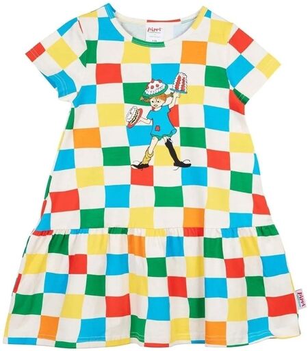 En farverigt ternet Pippi Langstrømpe-kjole til børn. A-line kjolen har korte ærmer, rund halsudskæring, Pippi gummiprint foran og bred flæsekant i nederdelen. Produktet indeholder certificeret økologisk bomuld. Materiale: 95% økologisk bomuld, 5% elastan 40 °C - Vask med lignende farver, vend vrangen ud før vask. Må ikke tørretumbles. Stryg på den forkerte side. Mærke: Martinex ...