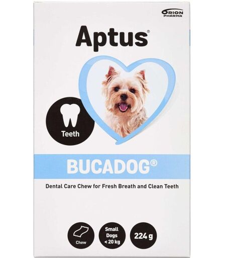 Bucadog tyggelapper small er belagt med vallepulver, en naturlig kilde til dentalvenlige enzymer, der sammen med tyggelappernes mekaniske tyggemodstand understøtter god mundhygiejne. Tilskudsfoder til hund. Dosis og Anvendelse Giv hunden en tyggelap dagligt efter hovedmåltidet. For at opnå det bedste resultat anbefaler vi, at tyggelapperne kombineres med regelmæssig tandbørstning med Aptus Bucadog enzymbaseret tandgel. ...