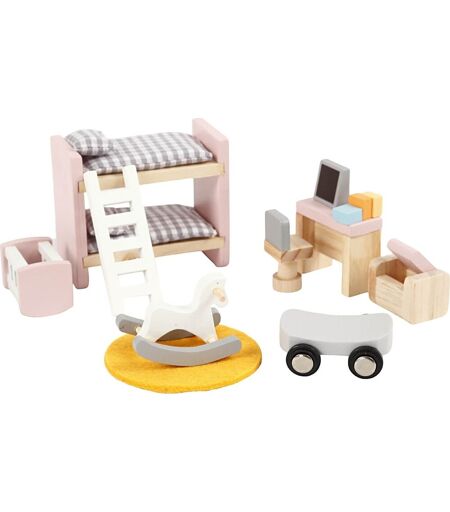 VIGA Dukkehusmøbler til børneværelse Dette møbelsæt fra VIGA er lavet i træ og passer perfekt til ethvert dukkehus. Møbelsættet består af møbler til børneværelset som fx en køjeseng, en vugge, en gyngehest og et skrivebord. Dukkehusmøblerne lægger op til mange timers rolleleg, hvor dit barn får mulighed for at bruge sin fantasi, udtænke hverdagsscenarier og stimulere sin evne til at vise omsorg, når dukkerne leger med hinanden. Specifikationer: Produkttype: Dukkehusmøbler, børneværelse Farve: Natur, lyserød, grå, gul Indeholder: Køjeseng med dyner og puder, stige, vugge, skrivebord med tilbehør, kontorstol, bænk, gyngehest, tæppe, bil Rolleleg og socialt samspil Stimulerer barnets finmotorik og fantasi Styrker barnets evne til empati og omsorg Velegnet til børn fra 3 år Materiale: Træ og tekstil Størrelse: 2 x 2 x 7,5 cm Rolleleg og stimulering af barnets fantasi Disse dukkehusmøbler er fint designet og har mange flotte detaljer, som blot gør legen endnu sjovere. Dit barn kan åbne og lukke bænken, lægge dukkerne til at sove under dynen og lege med gyngehesten. Har dit barn flere dukker, kan de sige godnat til hinanden, og måske har dit barn allerede observeret dig sidde foran en computer, så dukken nu kan gøre det samme. Kun fantasien sætter grænser. ...