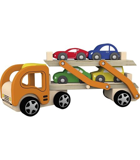 VIGA Biltransporter med 4 små biler Denne biltransporter fra VIGA består af en lastbil med lad, hvor der er plads til 4 små biler. Der er to etager på ladet, hvor bilerne kan opsamles og parkeres. Den øverste etage kan trækkes ned, så der laves en rampe, hvor bilerne kan køre af og på. Specifikationer: Produkttype: Biltransporter Antal: 1 biltransporter og 4 biler En grøn, blå, gul og rød bil Biltransporteren har et lad med to etager Ladet kan trækkes ned, så der laves en rampe til bilerne Stimulerer finmotorikken Lægger op til fantasifulde lege Oplagt til børn fra 3 år Materiale: Træ Størrelse: 29 x 15 x 8 cm Finmotorik og fantasi Når dit barn leger og kører rundt med bilerne, stimuleres finmotorikken. Størrelsen på bilerne gør det nemt for dit barn at styre dem og tage dem op. Ladet på biltransporteren kan lægges ned, så der dannes en rampe til bilen. Herved kan dit barn lege masser af lege med bilerne, der enten kan lastes eller læsses af. Måske er bilerne splinternye. Måske er bilerne gået i stykker og skal over til mekanikeren. Kun fantasien sætter grænser. ...