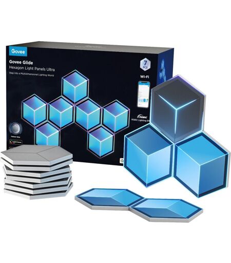 Med Glide Hexagon Light Panels Ultra kommer stemningsfuld belysning ind i ethvert rum. Disse sekskantede belysningselementer kan frit fastgøres til en væg og kombineres for at skabe ethvert mønster. De producerer varm til kølig hvid eller, hvis det ønskes, farvet belysning, som kan styres via app via WLAN eller Bluetooth. Takket være RGBIC kan farverne klassificeres endnu finere end med konventionel RGBW-teknologi. Overflade- og linjedesignet af de enkelte paneler kan opnå flotte 3D-effekter - efter ønske og tematisk tilpasset rummet. Det skaber for eksempel et belysningselement, der matcher gaming – eller en kunstnerisk udsmykning til stuen. Dette sæt indeholder 7 belysningselementer og matchende tilbehør til direkte idriftsættelse. ...