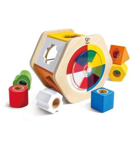 UTVECKLA FÄRGIGENKÄNNING: Barn lär sig att para ihop namnen på färger med deras former. Detta förbättrar deras förmåga att känna igen färger. LÄRANDE OM FORMER: Barn lär sig om olika former när de leker eftersom de olika formerna gör det enklare för dem att skilja på olika bitar. UTVECKLA MOTORIKEN: Att vända och vrida på formerna för att få dem att passa i hålen kräver pincettgrepp där tummen och pekfingret arbetar tillsammans. KLOSSAR MED FLERA FUNKTIONER: De 6 klossarna har olika funktioner: trekanten har ljud, krysset har en spegel och alla de 4 klossarna har ett plexiglasark i olika färg. FÄRGBLANDNINGSHJUL: Genom att vrida på färghjulet kan barnen lära sig hur färger blandas genom att titta genom det transparenta plexiglaset. Från 12 månader. ...