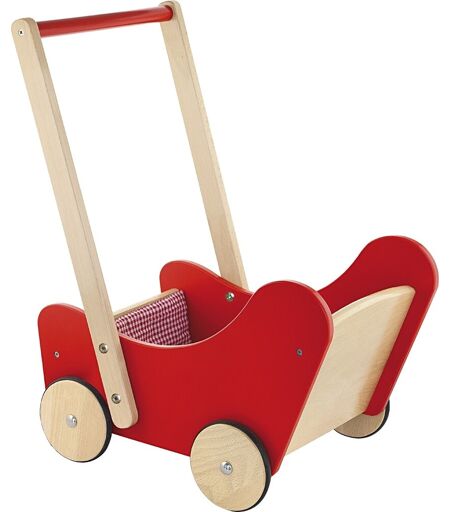 VIGA Dukkevogn i bøgetræ Med denne fine dukkevogn fra VIGA kan dit barn gå tur med dukken eller bamsen. Dukkevognen har en hynde, så dukken kan ligge behageligt, og gummiringene på hjulene gør det nemmere at skubbe vognen, samtidig med at de sikrer, at gulvet ikke bliver ridset. Vognen lægger op til mange timers leg, hvor dit barn får rig mulighed for at vise omsorg, når dukken fx skal puttes. Specifikationer: Produkttype: Dukkevogn Farve: Natur og rød Gummiringe på hjulene Pude nede i vognen Rolleleg og sociale kompetencer Styrker barnets evne til empati og omsorg Velegnet til børn fra 18 måneder Materiale: Bøgetræ Størrelse: 52 x 44 x 30 cm Rolleleg og stimulering af barnets fantasi Denne dukkevogn er fint designet og har flotte detaljer, som blot gør legen endnu sjovere. Den polstrede hynde gør det behageligt for dukken eller bamsen at ligge i vognen, og der er plads til, at dit barn kan putte dukken med endnu flere dyner og puder. Dukkevognen lægger op til mange snakke mellem dit barn og dukken, og den er med til at stimulere dit barns evne til at vise empati og omsorg overfor dukken. ...