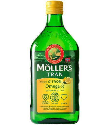 Møllers Tran fiskeolie er lavet af vildt fanget norsk arktisk torsk og giver et højt indhold af omega-3 fedtsyrer (1200 mg) samt vitamin A, D og E. Naturlig aroma af citron. Omega-3 fedtsyrerne EPA og DHA bidrager til en normal hjertefunktion og DHA bidrager også til en normal hjernefunktion og syn. Den gavnlige effekt opnås ved et dagligt indtag på 250 mg EPA& DHA. Vitamin A bidrager til at vedligeholde et normalt syn samt immunsystem. Vitamin D bidrager til normal optagelse og udnyttelse af calcium og fosfor; et normalt immunforsvar og vedligeholder normale knogler. Vitamin E bidrager til at beskytte cellerne mod oxidativ stress. Dispenseringsform Flydende ...