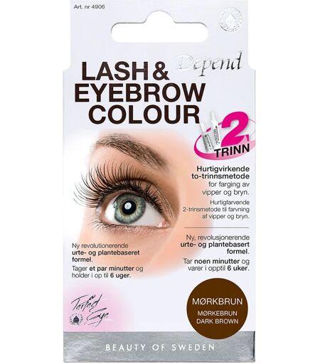 Depend Cosmetic PE Lash og Eyebrow Colour - Dark Brown er en pakke med permanent farve til øjenvipper og -bryn, som giver dig friske øjne uden makeup. Dine øjne er altid naturligt markerede – lige fra morgenstunden, når du dyrker sport, soler dig eller bader. Produktet er udviklet med en revolutionerende urte- og plantebaseret formel og indeholder bl.a. røllike, morgenfrue, grøn te og blåbær. En unik sammensætning, som er vandfast, skånsom at anvende, nem og hurtig at påføre, og som giver en intensiv farve, der holder længe, og også giver et indtryk af længere vipper og mere markerede bryn. Behandlingen tager kun nogle minutter, og resultatet holder i op til 6 uger. Indholdet i pakningen rækker til 5-7 behandlinger. Fordele: Permanent bryn- og vippefarve Intensiv farve Skånsom at anvende Nem og hurtig at påføre Holder i op til 6 uger Rækker til 5-7 behandlinger Vegansk Indeholder: 1 tube farvegel (Tube 1) 1 tube Aktiveringsgel (Tube 2) 2 stk. påføringsbørster Beskyttelsescreme Beskyttelsespapir til farvning af vipper Brugsanvisning Anvendelse: Læs først hele brugsanvisningen, sikkerhedsinformationen og informationen om allergitesten omhyggeligt, inden du starter din behandling. Rengør altid omhyggeligt påføringsbørsterne med lidt vand og opvaskemiddel efter brug. Farvning af vipper: Læg en jævn streg af farvegel (Tube 1) langs den ene påføringsbørste Fordel gelen jævnt over børsten med tubespidsen Påfør gelen på vipperne med påføringsbørsten som en mascara Det er vigtigt at alle vipper gennemfugtes med gelen fra rod til spids, undgå kontakt med øjnene Lad gelen virke i 2 minutter Fjern omhyggeligt al overskydende gel fra vipperne med en vatrondel Vent 5 minutter inden påføring af aktiveringsgel Imens smøres beskyttelsescreme på det nedre øjenlåg og huden nærmest vipper og bryn Sæt beskyttelsespapir på så tæt på den nedre vippe som muligt Læg en jævn streg aktiveringsgel (Tube 2) langs den anden påføringsbørste Fordel gelen godt over hele vippen med børsten, undgå at få gel i øjnene Hvis der er kommet gel på huden, skal den aftørres med det samme for at undgå misfarvning af huden Lad virke i 1 minut Fjern herefter omhyggeligt al farve med en vatrondel fugtet med lunkent vand Farvning af bryn: Læg en jævn streg af farvegel (Tube 1) langs den ene påføringsbørste Fordel gelen jævnt over børsten med tubespidsen Fordel gelen godt over hele øjenbrynet med påføringsbørsten Det er vigtigt at alt hår, der skal farves er godt gennemfugtet med gel Lad gelen virke i 2 minutter Fjern omhyggeligt al overskydende gel fra brynet med en vatrondel Vent 5 minutter inden påføring af aktiveringsgel Imens påføres beskyttelsescreme med en vatpind på hudområdet omkring brynene, hvor du ikke vil have farve Undgå at få beskyttelsescreme i brynene, der skal farves, da det vil forringe farveresultatet Læg en jævn streg aktiveringsgel (Tube 2) langs den anden påføringsbørste Fordel gelen godt over hele brynet med børsten, så alle hår er gennemfugtede med gel Hvis der er... ...