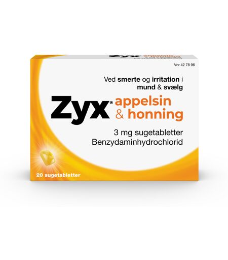 Zyx anvendes mod smerter og irritation i mund og svælg. Zyx 3 mg benzydaminhydrochlorid sugetabletter virker ved at lindre lokal irritation af mund og svælg. Endvidere har benzydamin en moderat lokalbedøvende effekt. Børn under 6 år må ikke anvende Zyx pga. kvælningsrisiko. I pakningerne med medicin findes en patientvejledning, som du altid bør læse grundigt, inden du tager medicinen. Hvis du er i tvivl om du må bruge medicinen, bør du kontakte egen læge. Sidst opdateret d. 10/07-2025. ...
