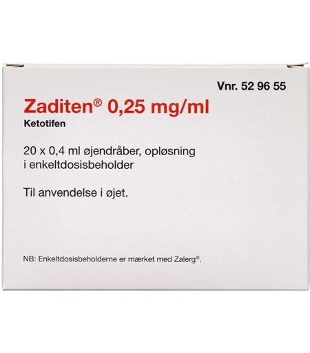 Anvendes som er et anti-allergisk middel. Zaditen bruges til behandling af symptomer på pollenallergi i øjnene. Bør ikke gives til børn under 3 år uden lægens anvisning. I pakningerne med medicin findes en patientvejledning, som du altid bør læse grundigt, inden du tager medicinen. Hvis du er i tvivl om du må bruge medicinen bør du kontakte egen læge. Senest opdateret d. 07/10-2024. ...