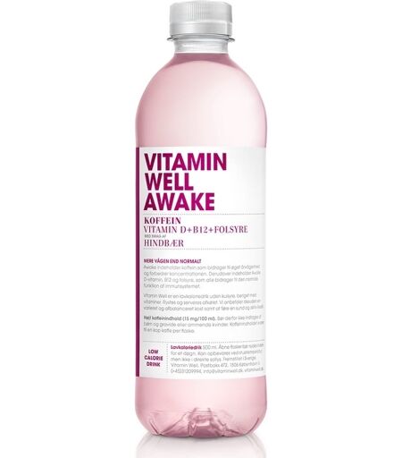 Vitamin Well Awake – mere vågen end normaltVitamin Well Awake indeholder koffein, som bidrager til øget opmærksomhed og forbedret koncentration. Derudover indeholder Awake vitamin D, B12 og folsyre, der alle bidrager til immunsystemets normale og daglige funktion. Awake har en forfriskende smag af hindbær og har et højt koffeinindhold, svarende til en kop kaffe pr. flaske. Drikken indeholder desuden hyldebærekstrakt og grøn te ekstrakt. Vitamin Well er en lavkalorie-drik beriget med vitaminer. Den indeholder 4,2 g sukker per 100 ml og det anbefales at den bruges som supplement til en varieret og afbalanceret kost, samt en sund og aktiv livsstil.Smag: HindbærIndhold: 0,5 literVitaminer: D, B12, folsyreHøjt koffeinindhold (15 mg/100 ml)Prisen er ekskl. pant B på kr. 1,20 pr. flaske ekskl. moms (kr. 1,50 inkl. moms) NB! Drikken anbefales ikke til børn og gravide og ammende kvinder. ...