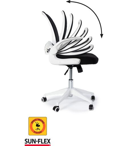 Sun-Flex HideawayDenne kontorstol er udviklet og designet med det moderne og fleksible kontor eller til hjemmekontoret hvor pladsen kan være knap.Med Sun-Flex's pladsbesparende system har man muligheden for at klappe ryggen ned så stolen kan skubbes helt ind under bordet. Dette gør at stolen nemt kan gemmes væk når den ikke er i brug.Hideaway stolen findes i sort og kan kun fåes med netryg. Stolen er lavet til let brug da den ikke er udstyret med en masse funktioner. Stolen kan justeres i højden og har også vægtjustering i vippet. Netryggen har en indbygget lændestøtte der ikke kan justeres.Farve: HvidLet brug: 4-8 timer pr. dagArmlæn kan vippes op. Højdejusterbar: 45-55 cmMaks. belastning: 150 kgMateriale: Sort stof sæde og sort netryg (50.000 martindale) ...