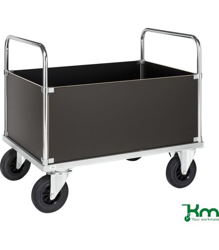 Lagervogn 630 med 4 høje sider500 kg lasteevne og let at manøvrereSpecifikationer:Sider i lakeret stål og 2 mm galvaniseret stålplade som bundRengøringsvenlig2 faste og 2 drejelige hjul200x50 mm massive hjulBøjle i 25 mm stålrørLastekapacitet: 500 kgMål i cm (LxBxH): 100x70x90Gavlhøjde: 40 cmVægt: 44 kg ...