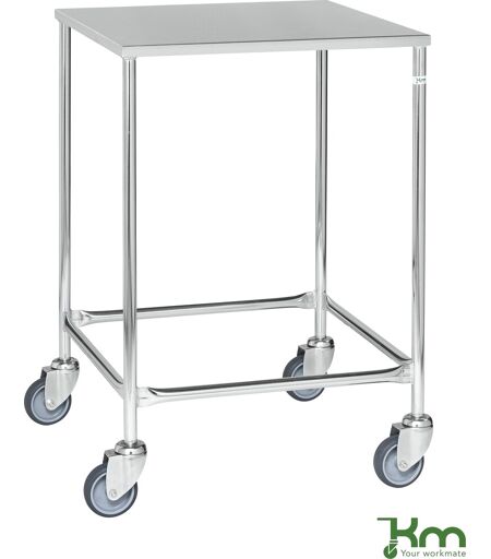 Stålbord som som serveringsvogn med 1 hylde - leveres færdigsamlet Mål (LxBxH): 605x605x885 mm Helsvejset galvaniseret stålramme Hylder er beklædt med 1 mm rustfri stålplade 4 drejelige hjul, 100 mm Kapacitet: 150 kg Vægt: 15 kg ...