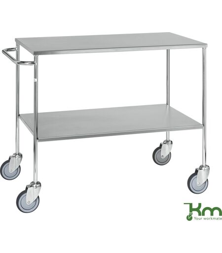 Mål (LxBxH): 1000x580x870 mm Helsvejset galvaniseret stålramme Hylder er beklædt med 1 mm rustfri stålplade Afstand mellem hylder: 450 mm 4 drejelige hjul, 125 mm Kapacitet: 200 kg Vægt: 31 kg ...
