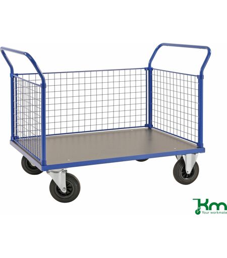 Lagervogn med 3 stk. gittersider i blålakeret stål. 500 kg lasteevne og let at manøvrere Blålakeret stål med slidstærk overflade i laminat Rengøringsvenlig 2 faste og 2 drejelige hjul 200x50 mm massive hjul Bøjle i 25 mm stålrør Lastekapacitet: 500 kg Mål i cm (LxBxH): 100x70x102 Vægt: 34 kg ...