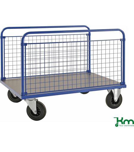 Lagervogn med 2 stk. gittersider i blålakeret stål. Let at manøvrere, og leveres med slidstærk overflade i laminat. 500 kg lasteevne og let at manøvrere Blålakeret stål med slidstærk overflade i laminat Rengøringsvenlig 2 faste og 2 drejelige hjul 200x50 mm massive hjul Bøjle i 25 mm stålrør Lastekapacitet: 500 kg Mål i cm (LxBxH): 100x70x90 Vægt: 35,5 kg ...