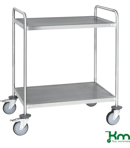 Rustfrit rullebord med 2 hylderKvalitets bordvogn med en stærk fuldsvejset konstruktion i rustfrit stål, der gør den solid og holdbar. Proffline rullevognen er særdeles velegnet til fødevarer, men har et vel af anvendelsesmuligheder til brug på hospitaler, institutioner, restaurationer eller f.eks. i industrien. Rullebordets glatte overflade gør den let at rengøre. Alle fire hjul er drejelige 125 mm hjul, hvoraf to er med bremse. Rullebordet vejer kun 12,5 kg og har en bæreevne på 200 kg.Rustfrit stål (18/8) klasse C3Mål i cm (LxBxH): 65x44x101 cm. 2 hylder - hyldestørrelse (LxB): 62,5x41,5 cmHøjde til øverste hyldeplan: 90 cmAfstand mellem hylder: 61,5 cm. 4 drejelige hjul, 2 med bremse – 125 mm.Vægt: 12,5 kg - belastning: 200 kg.5 års garanti Leveres samlet ...