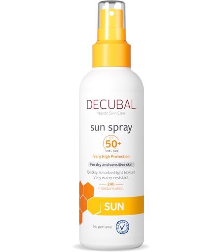 Decubal Sun Spray SPF50+ tilbyder en meget høj, bredspektret beskyttelse mod solens skadelige stråler og en øjeblikkelig og langvarig fugtgivende effekt. Beskytter mod UVB- & UVA- stråler. Meget vandfast. Uden parfume & uden alkohol. En hurtig absorberende og fugtgivende solspray med E-vitamin- antioxidanter, der hjælper med at genopbygge hudens barriere. Med plejende avokadoolie, der virker naturligt blødgørende på huden, fugter og plejer Decubal Sun Spray SPF50+ selv den mest tørre, sensitive hud. Velegnet til spædbørn, børn og voksne til ansigt og krop. Allergicertificeret Med BASF EcoSun Pass label (WIP) - Miljøvenlige solprodukter. ...