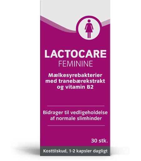 Lactocare Feminine Kapsler er et kosttilskud indeholdende mælkesyrebakterier med tranebærekstrakt og vitamin B2. Lactocare Feminine Kapsler ...