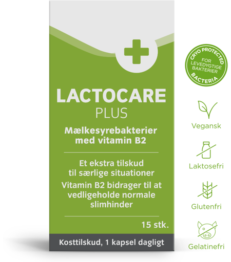 Lactocare Plus kapsler er et kosttilskud med mælkesyrebakterier og vitamin B2. Mælkesyrebakterier er naturligt til stede i vores tarmkanal. Her findes de overordnet i to arter: Lactobacillus, der primært findes i tyndtarmen, og Bifidobakterier, der primært er til stede i tyktarmen. Lactocare Plus kapsler ...