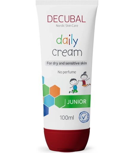 Decubal Junior Daily Cream er en intensivt fugtgivende creme til børn i alle aldre med tør og sensitiv hud på kroppen og i ansigtet. Formlen med bl.a. glycerin, Vitamin E og et fedtindhold på 38 %, som fugter, nærer og blødgør den tørre hud. Det er klinisk bevist, at denne creme styrker og beskytter den naturlige hudbarriere, så den bevarer fugtigheden og hjælper med at fremme hudens egen evne til at holde på fugten. Cremen har en let tekstur, som gør den nem at påføre og føles ikke fedtet, men efterlader en blød og glat følelse. Den er egnet til daglig brug overalt på kroppen, i ansigtet eller specifikt på områder såsom kinder, øreflipper, hænder og albuer. Du får en god allround creme til børn til både pleje og forebyggelse af tør hud, som er både AllergyCertified, vegansk, uden parfume og farvestoffer. Fordele: Allround creme Velegnet til børn i alle aldre Til tør og sensitiv hud på kroppen og i ansigtet 38 % fedtindhold Fugter intensivt, nærer og blødgør huden Styrker og beskytter hudbarrieren Binder fugt i huden Let og hurtigabsorberende konsistens Føles ikke fedtet AllergyCertified Uden parfume og farvestoffer Vegansk Anvendelse: Påføres tør hud dagligt eller efter behov Massér nænsomt ind i huden Kan bruges på hele kroppen, i ansigtet eller til specifikke områder såsom kinder, øreflipper, hænder og albuer Påføres 20 minutter inden barnet skal udenfor, så cremen kan nå at trænge helt ind i huden, før den udsættes for kulde Ingrediensliste: Aqua, Petrolatum, Parafffinum Liquidum, Glycerin, Pentylene Glycol, Cetearyl Alcohol, Methyl Glucose Sesquistearate, PEG-20 Methyl Glucose Sesquistearate, Tocopherol, Ethylhexylglycerin, Acrylates/C10-30 Alkyl Acrylate Crosspolymer, Sodium Gluconate, Sodium Hydroxide, Citric Acid. ...