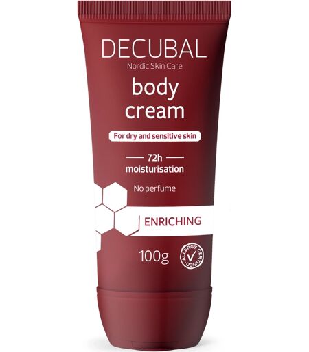 Decubal Enriching Body Cream er en ekstra nærende creme, som er udviklet specielt til pleje af tør, meget tør og sensitiv hud på kroppen. Formlen med et tredobbelt fugtighedsgivende kompleks af glycerin, lanolin, naturlige olier og et 40 % fedtindhold fugter og nærer huden i dybden, samt genopretter dens blødhed. Cremen er klinisk testet til at give en øjeblikkelig og langvarig (72 timer) fugtighedsgivende virkning. Denne creme er velegnet til daglig brug til hele familien. Den har en rig konsistens, som er nem at påføre og absorberes hurtigt i huden, hvilket efterlader huden blød, fugtet og glat. Den er desuden AllergyCertified og parfumefri. Fordele: Creme til kroppen Til tør, meget tør og sensitiv hud 40 % fedtindhold Fugter og nærer huden i dybden Genopretter hudens blødhed Velegnet til daglig brug til hele familien Rig og hurtigabsorberende konsistens AllergyCertified Uden parfume Anvendelse: Anvendes på ren hud Masseres ind i huden på hele eller dele af kroppen Kan bruges dagligt eller efter behov Ingrediensliste: Aqua, Caprylic/Capric Triglyceride, Glycerin, Isopropyl Myristate, Lanolin, Petrolatum, Polyglyceryl-3 Methylglucose Distearate, Glyceryl Stearate, Tocopheryl Acetate, Cetearyl Alcohol, Ceteareth-20, Sodium Cetearyl Sulfate, Tocopherol, Dimethicone, Citric Acid, Phenoxyethanol, Sodium Benzoate. ...