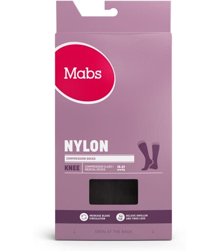 Mabs Nylon Knee Black er elegante nylonknæstrømper med kompression i nylon i 140 denier. Til hverdagsbrug. Øger blodgennemstrømningen og giver lindring til hævede og trætte ben. Modvirker risikoen for årebrok og blodprop og giver behagelig støtte. Strømpen er strikket i et behageligt, bæredygtigt OEKO-tex-certificeret materiale og er i kompressionsklasse 1 (15-21 mHg), 140 denier. For at finde din strømpestørrelse og sikre en optimal pasform er der tre mål, du bør tage højde for (i nedenstående rækkefølge). Tænk på, at du skal måle dig selv om morgenen, inden benene eller fødderne bliver hævede. 1) Omkredsen om anklen på det sted, hvor den er smallest (A). 2) Omkredsen om læggen på det sted, hvor den er bredest (B). 3) Din skostørrelse (C). Bemærkning Må ikke bleges eller stryges.Må ikke anvendes efter udløbsdatoen.Åbn emballagen forsigtigt.Vask kompressionsstrømperne hver dag for at undgå irritation forårsaget af sved.Lad ikke Mabs kompressionsstrømper sidde på om natten, medmindre din læge specifikt har ordineret det. Når du ligger ned, befinder dine ben sig i en neutral position, som lader blodet strømme frit. Gradueret kompression i denne position øger blodcirkulationen, hvilket dog er unødvendigt.Rådfør dig med din læge, hvis du ønsker at bruge Mabs kompressionsstrømper i kombination med medicinsk behandling af en alvorlig tilstand.Ældre, handicappede og gravide kan have brug for hjælp med at tage kompressionsstrømperne på.Mabs kompressionsstrømper må ikke udsættes for kraftigt sollys, da det kan påvirke deres kompressionsevne. ...