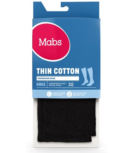 Mabs Cotton Knee er tynde og behagelige bomuldsstrømper med kompression velegnet til hverdagsbrug. Mabs Cotton Knee knæstrømpe øger blodgennemstrømningen, giver lindring til hævede og trætte ben samtidig med de modvirker risikoen for årebrok og blodprop. Strømpen er strikket i et behageligt og bæredygtigt OEKO-tex-certificeret materiale, har kompressionsklasse 1 (15-21 mmHg) og en gradueret kompression, som er størst ved anklen og aftager op mod knæet. Kompressionsstrømpen øger blodgennemstrømningen i benene, så du kan føle dig frisk i benene hele dagen, uanset om du står, går eller sidder meget. For at finde din strømpestørrelse og sikre en optimal pasform er der tre mål, du bør tage højde for (i nedenstående rækkefølge). Tænk på, at du skal måle dig selv om morgenen, inden benene eller fødderne bliver hævede. 1) Omkredsen om anklen på det sted, hvor den er smallest (A). 2) Omkredsen om læggen på det sted, hvor den er bredest (B). 3) Din skostørrelse (C). Bemærkning Må ikke bleges eller stryges.Må ikke anvendes efter udløbsdatoen.Åbn emballagen forsigtigt.Vask kompressionsstrømperne hver dag for at undgå irritation forårsaget af sved.Lad ikke Mabs kompressionsstrømper sidde på om natten, medmindre din læge specifikt har ordineret det. Når du ligger ned, befinder dine ben sig i en neutral position, som lader blodet strømme frit. Gradueret kompression i denne position øger blodcirkulationen, hvilket dog er unødvendigt.Rådfør dig med din læge, hvis du ønsker at bruge Mabs kompressionsstrømper i kombination med medicinsk behandling af en alvorlig tilstand.Ældre, handicappede og gravide kan have brug for hjælp med at tage kompressionsstrømperne på.Mabs kompressionsstrømper må ikke udsættes for kraftigt sollys, da det kan påvirke deres kompressionsevne. ...