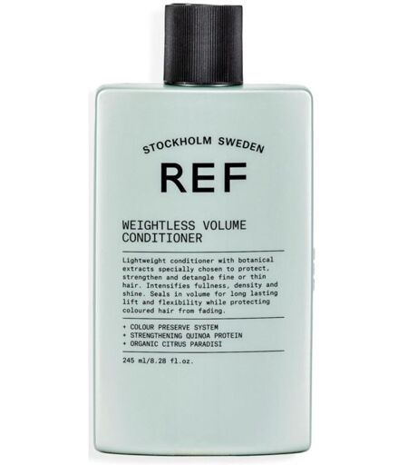 REF Weightless Volume Conditioner er en sulfat-fri conditioner til et fint og normalt hår. Den tilfører fylde og volume, så håret føles let og luftigt. Den er designet til at beskytte håret, udglatte håret samt udfiltre fint og tyndt hår. Conditioneren indeholder botaniske ekstrakter af blandt andet hvide Mulberry blade, hørfrø og Argan olie, som sammen plejer håret og efterlader det smukt og fyldigt. Fordele: Ideel til fint og normalt hår Virker plejende Sulfatfri Vegan venlig Farvebeskyttende Tilfører håret volume og fylde Anvendelse: Påføres i hårlængderne i nyvasket hår Lad det sidde i 1-3 minutter Skyl derefter håret grundigt Ingredienser: Aqua [Water], Cetearyl alcohol, Cetrimonium chloride, Cetyl esters, Amodimethicone, Panthenol, Phenoxyethanol, Simmondsia chinensis (Jojoba) seed oil, Parfum [Fragrance], Hydroxyethylcellulose, Ethylhexylglycerin, Quaternium-95, Calcium pantothenate, Citric acid, Hydrolyzed quinoa, Limonene, Propanediol, Hexyl cinnamal, BHT, Butylene glycol, Glycerin, CI 15510 [Orange 4], Helianthus annuus (Sunflower) seed extract, Citral, CI 47005 Yellow 10], Citrus paradisi (Grapefruit) fruit extract. ...