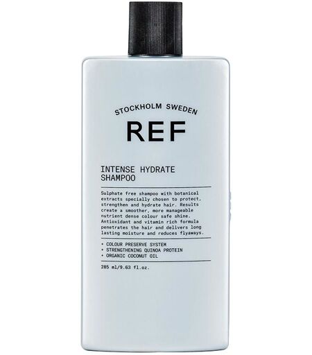 REF Intense Hydrate Shampoo er en sulfat fri shampoo med botaniske ekstrakter, specielt udviklet til at styrke, beskytte og give fugt til håret. Shampooen indeholder styrkende quinoa proteiner og er rig på vitaminer der bevarer fugtbalancen i håret og giver et langvarrigt blødgørende resultat. REF Intense Hydrate Shampoo trænger ind i håret og eliminerer krus, og giver samtidig en farvebeskyttende virkning. Den tiltalende duft fra organisk kokos olie kombineret med nærende antioxidanter giver dig et lækkert, uimodståeligt og velplejet hår. Fordele: Sulfat fri Vegan venlig Farvebeskyttende virkning Duft fra organisk kokos olie Rig på vitaminer og antioxidanter der bevarer fugtbalancen i håret Giver et langvarrigt og blødgørende resultat Efterlader dig med et lækkert, uimodståeligt og velplejet hår Anvendelse: Anvendes i vådt hår Massér ind i hovedbunden og i håret Skyl derefter grundigt ud Bruges efter behov ...